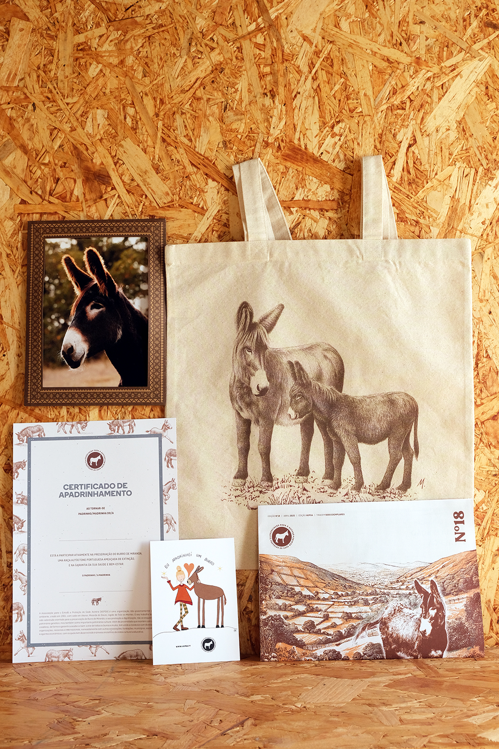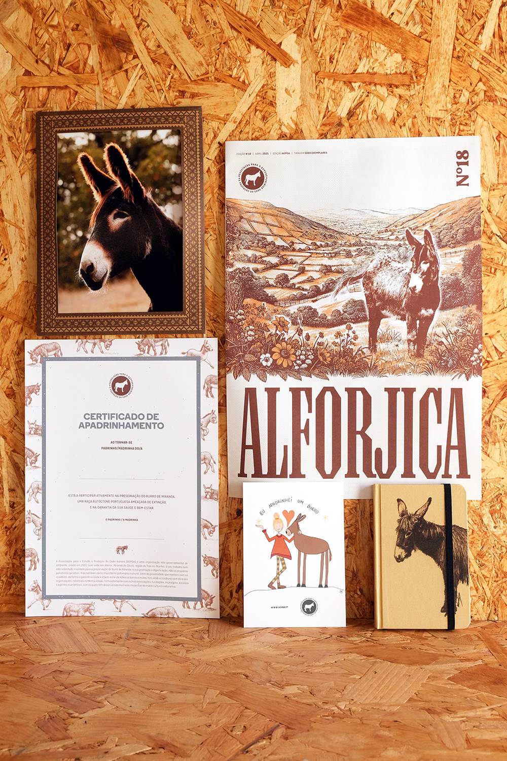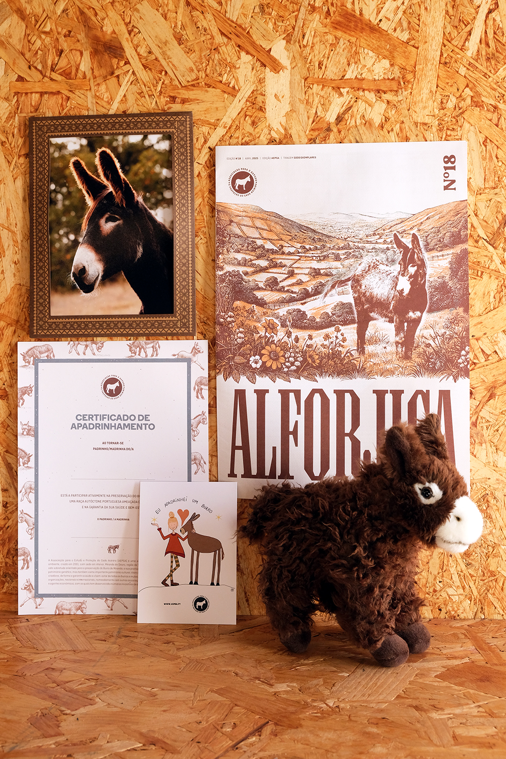 Inclui um certificado de apadrinhamento, uma fotografia do burro apadrinhado, o boletim informativo Alfojica, um postal, e um caderno (A6) com a ilustração do Burro de Miranda.