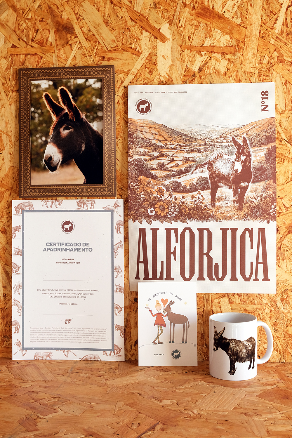 Inclui um certificado de apadrinhamento, uma fotografia do burro apadrinhado, o boletim informativo Alfojica, um postal e uma caneca de cerâmica.